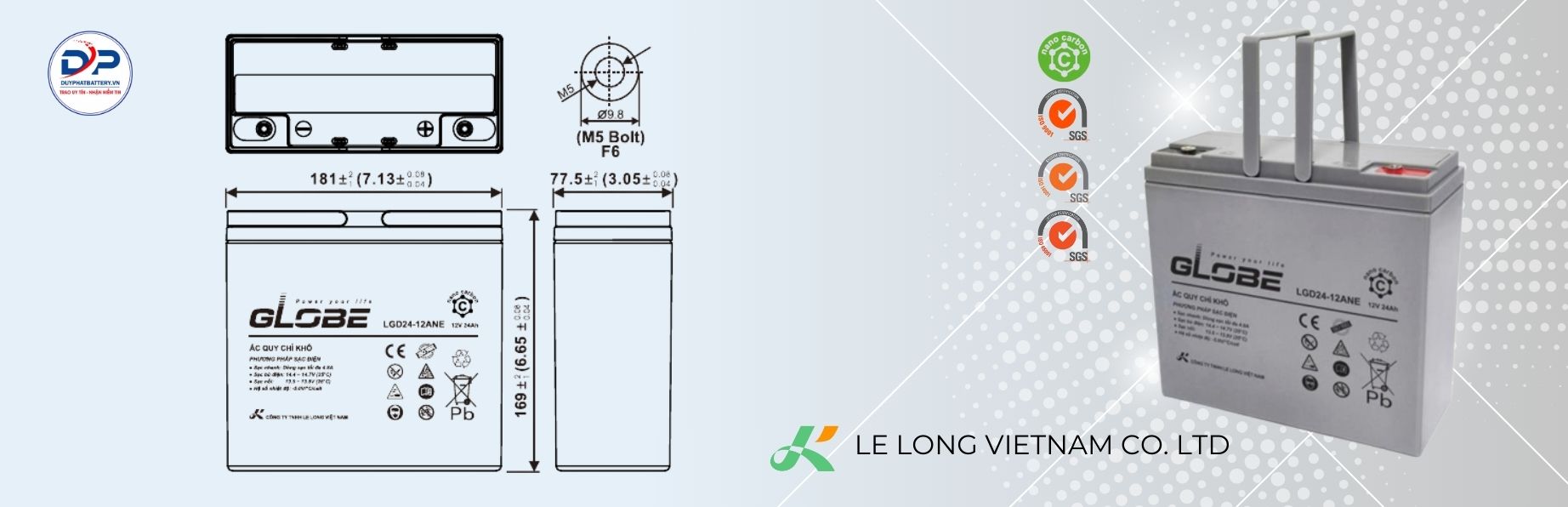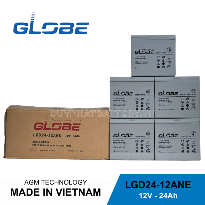 Ắc quy kín bán GEL LGD24-12ANE (12V-24AH) được thiết kế chuyên dụng cho xe điện Globe và các dòng xe điện phổ thông tại Việt Nam, mang lại hiệu suất ổn định – tuổi thọ cao – an toàn khi sử dụng.