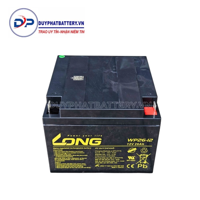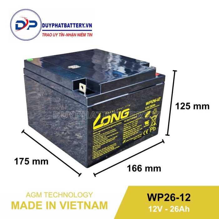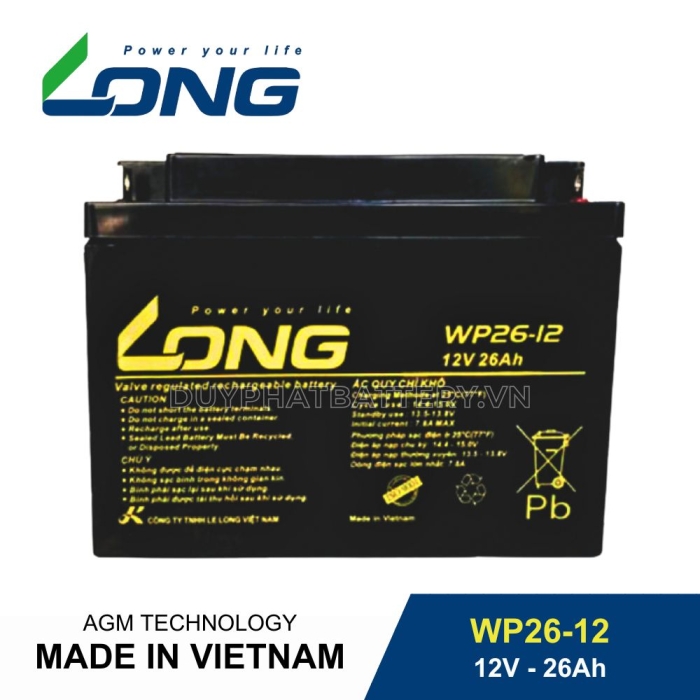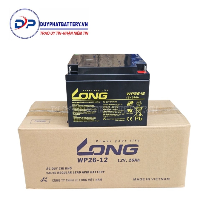 Ắc Quy Long WP26-12 12V-26Ah là dòng ắc quy khô miễn bảo dưỡng (AGM – VRLA) chất lượng cao, được sản xuất bởi Công ty LE LONG tại nhà máy Long An – Việt Nam, với 100% vốn đầu tư và công nghệ từ Đài Loan. Đây là thương hiệu ắc quy UPS Long nổi tiếng, chuyên sản xuất và xuất khẩu sang nhiều quốc gia, dẫn đầu thị trường Việt Nam trong lĩnh vực ắc quy lưu trữ điện.
