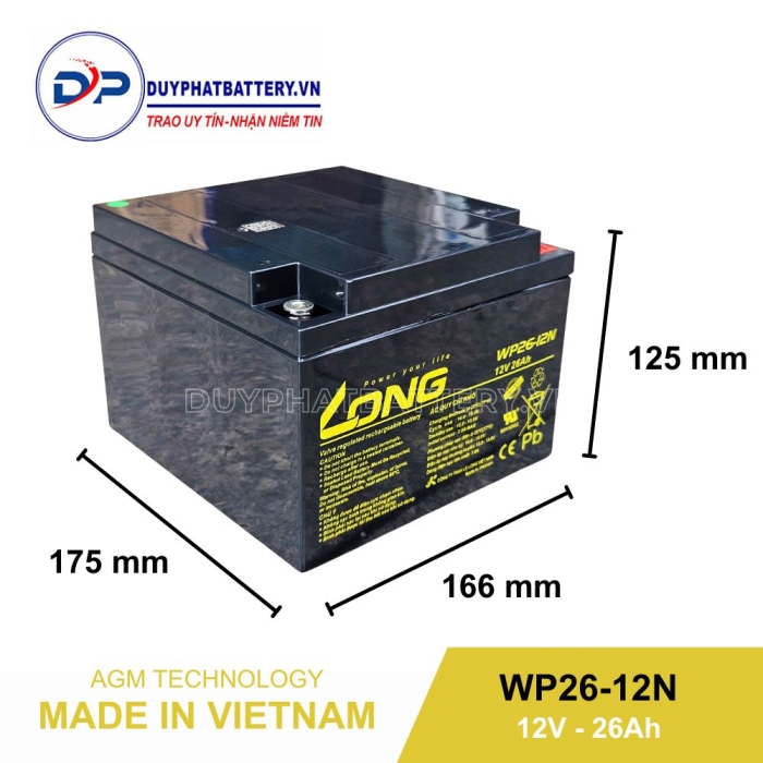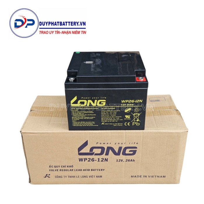 Ắc Quy Long WP26-12N 12V-26Ah là dòng ắc quy khô miễn bảo dưỡng (AGM – VRLA) chất lượng cao, được sản xuất bởi Công ty LE LONG tại nhà máy Long An – Việt Nam, với 100% vốn đầu tư và công nghệ từ Đài Loan. Đây là thương hiệu ắc quy UPS Long nổi tiếng, chuyên sản xuất và xuất khẩu sang nhiều quốc gia, dẫn đầu thị trường Việt Nam trong lĩnh vực ắc quy lưu trữ điện.