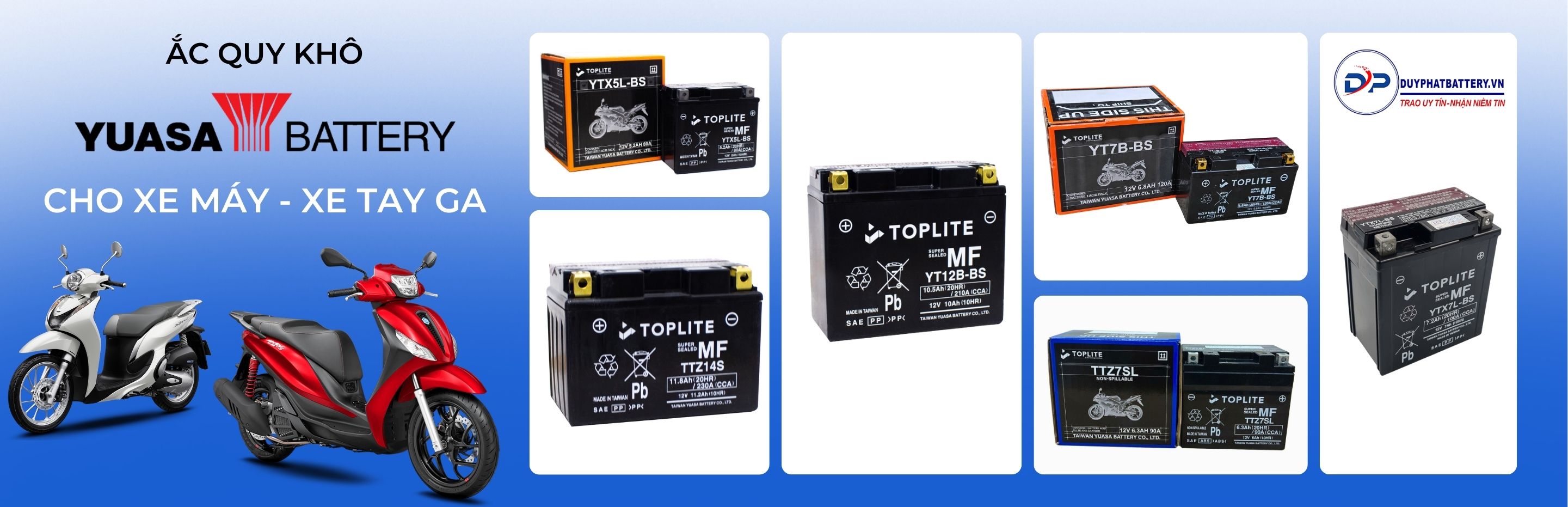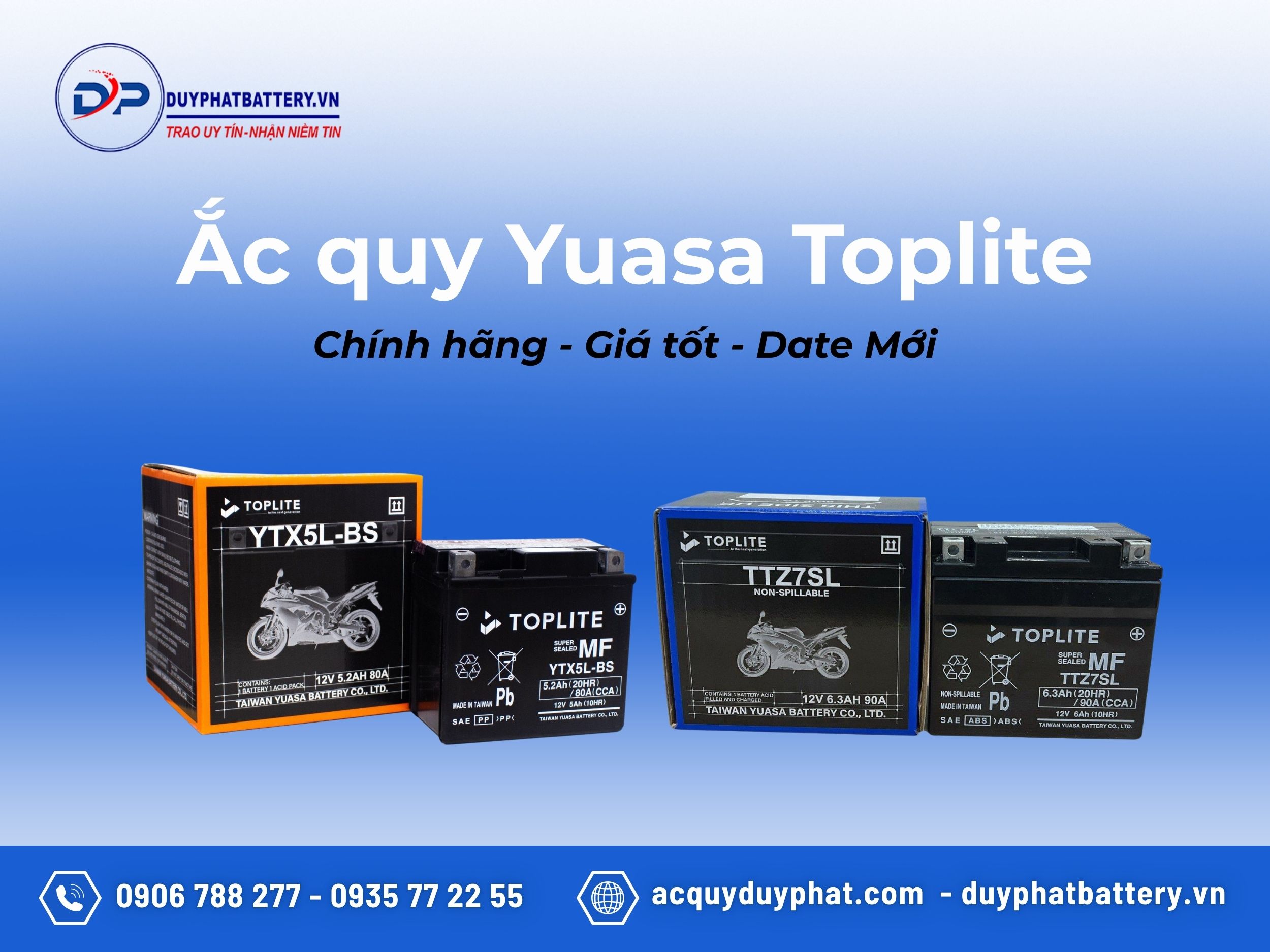 Ắc quy Yuasa Toplite là thương hiệu ắc quy nổi tiếng toàn cầu, được quản lý công nghệ bởi Nhật Bản và sản xuất tại Đài Loan. Đây là dòng ắc quy nhập khẩu chính ngạch 100%, có mặt tại Việt Nam hơn 10 năm và được xem là ắc quy số 1 châu Á cho xe mô tô thể thao, xe phân khối lớn (PKL).