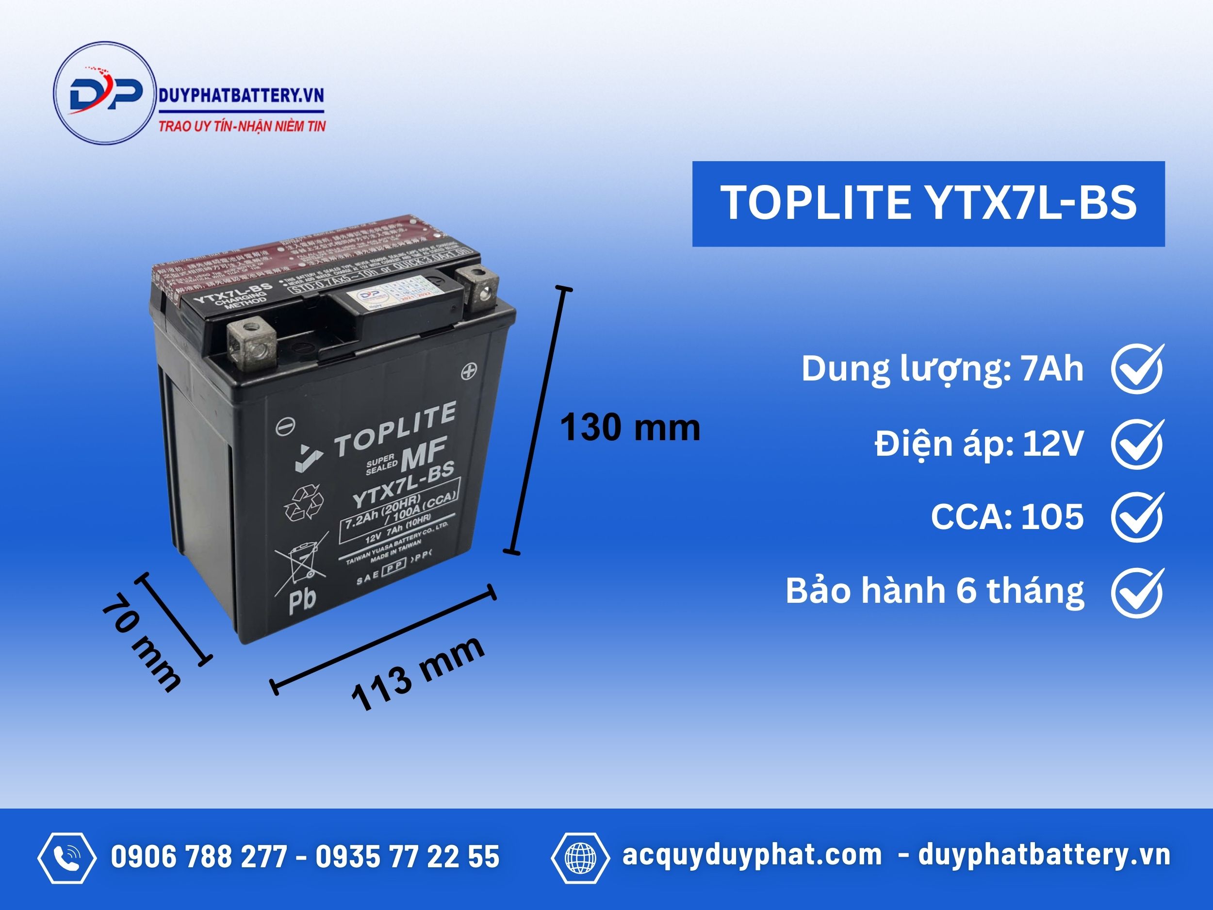 Khi thay mới bình ắc quy Toplite YTX7L-BS (12V-7Ah) tại Duy Phát, quý khách được: