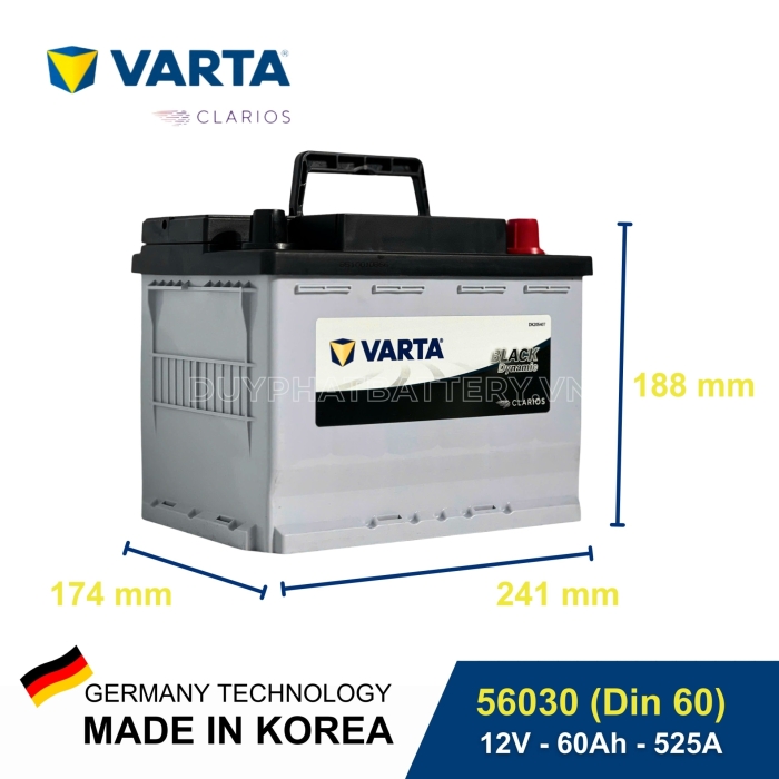 Bình ắc quy Varta DIN 56030 có công dụng dự trữ và cung cấp nguồn điện cho xe ô tô. Để sử dụng được, hộc chứa ắc quy của xe cần lớn hơn hoặc bằng kích thước thực tế của bình với chiều dài 241mm, rộng 174mm và chiều cao 188mm.