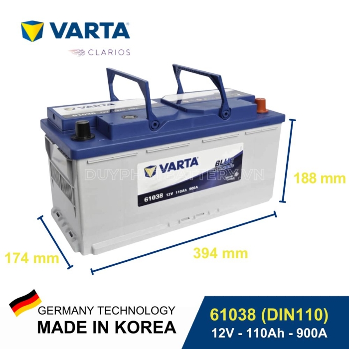 Bình ắc quy Varta DIN 61038 có công dụng dự trữ và cung cấp nguồn điện cho xe ô tô. Để sử dụng được, hộc chứa ắc quy của xe cần lớn hơn hoặc bằng kích thước thực tế của bình với chiều dài 394mm, rộng 174mm và chiều cao 188mm.