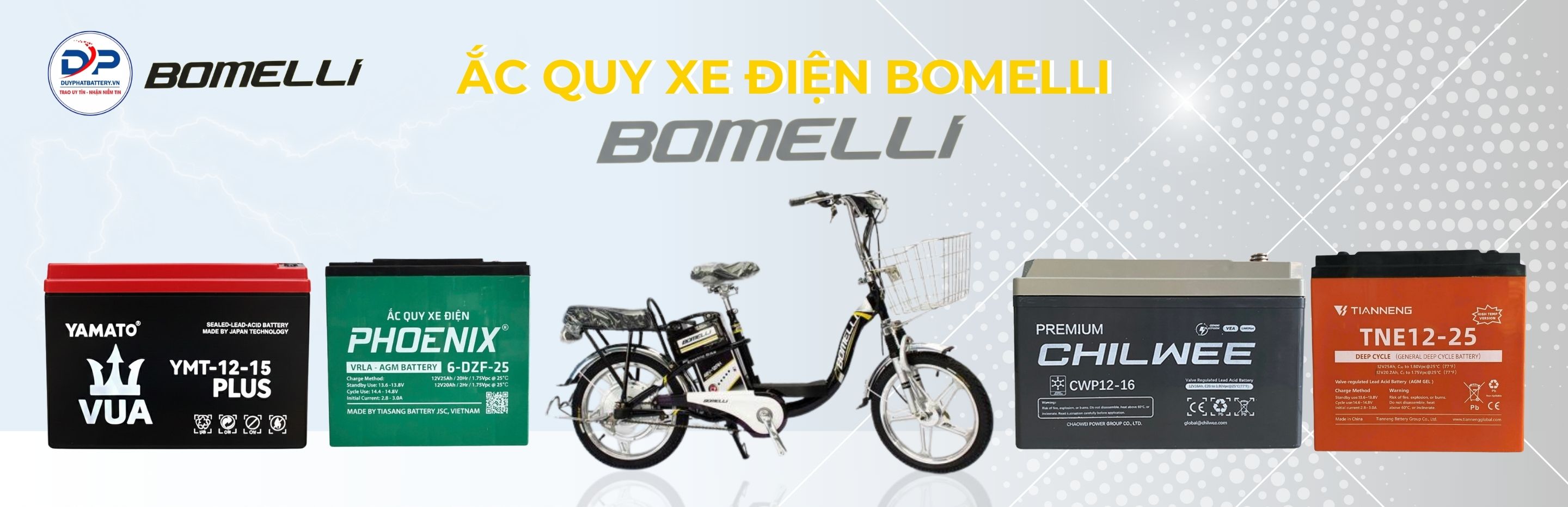 Hiện nay trên thị trường có nhiều thương hiệu ắc quy xe điện chất lượng cao được người dùng tin tưởng như: Yamato, Thiên Năng (Tianneng), Winmax, Chilwee, KPB, Xupai, Alaska… Những dòng ắc quy này nổi bật với hiệu suất ổn định, tuổi thọ cao và khả năng vận hành bền bỉ cho xe điện Bomelli.