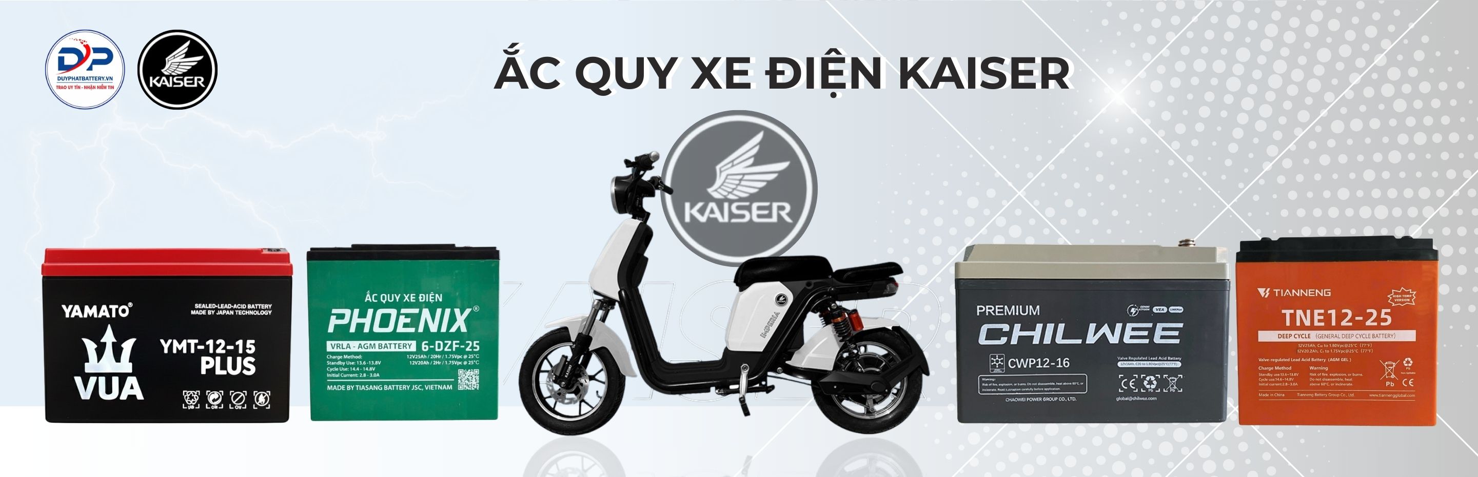 Các loại ắc quy xe điện Kaiser tại cửa hàng phù hợp với nhiều dòng xe phổ biến như: Kaiser X6, Kaiser Cap A, Kaiser K3, Kaiser S-Line 20A (xe đạp điện), Kaiser Crown (Vespa style),... và nhiều dòng xe điện Kaiser khác.
