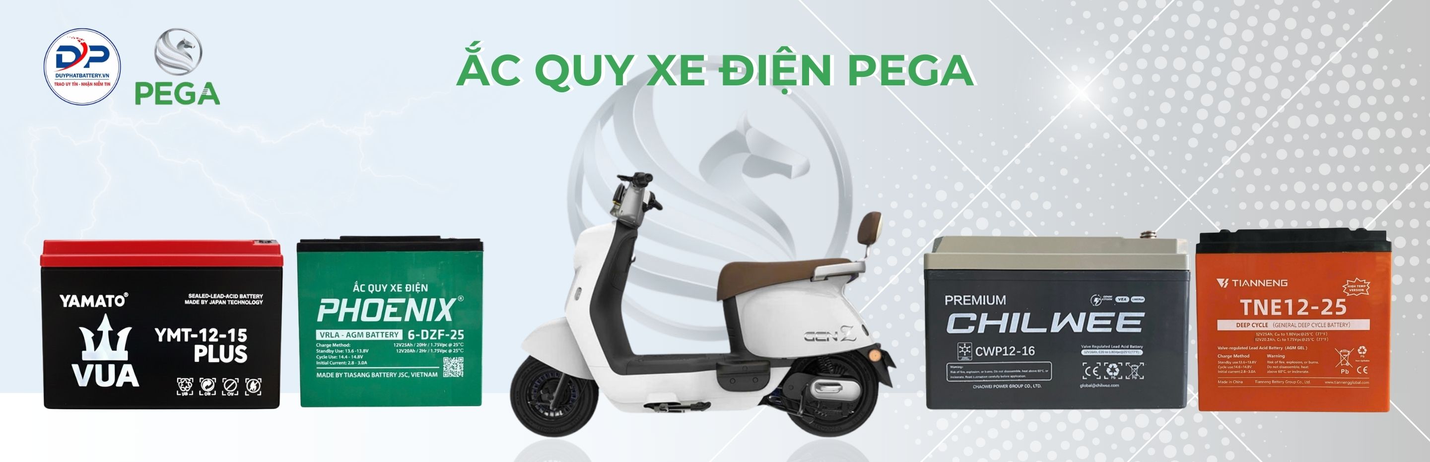 Các loại ắc quy xe điện Pega tại cửa hàng phù hợp với nhiều dòng xe phổ biến như: Pega S (cao cấp), Aura (phong cách Vespa), NewTech (như xe ga), X-Men (thể thao), cùng các dòng xe đạp điện phổ biến như Zinger 3, Cap-A9, Cap AT.