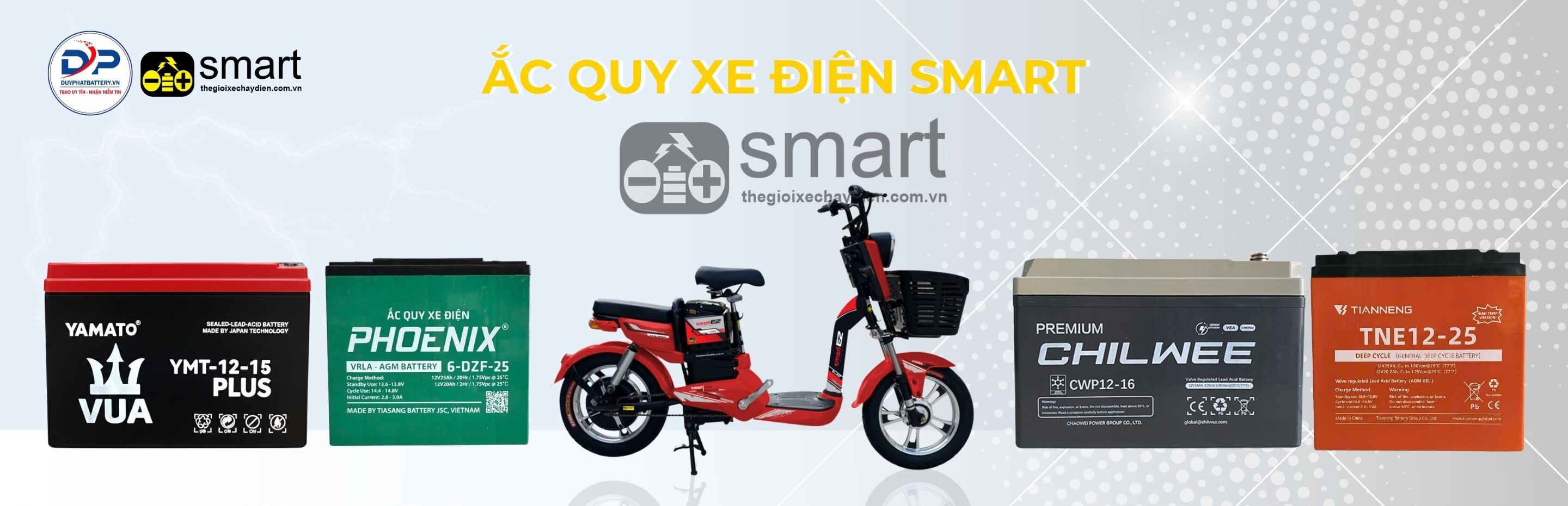 Hiện nay trên thị trường có nhiều thương hiệu ắc quy xe điện chất lượng cao được người dùng tin tưởng như: Yamato, Thiên Năng (Tianneng), Winmax, Chilwee, KPB, Xupai, Alaska… Những dòng ắc quy này nổi bật với hiệu suất ổn định, tuổi thọ cao và khả năng vận hành bền bỉ cho xe điện Smart.