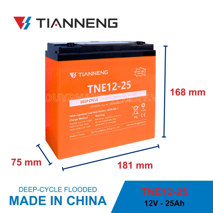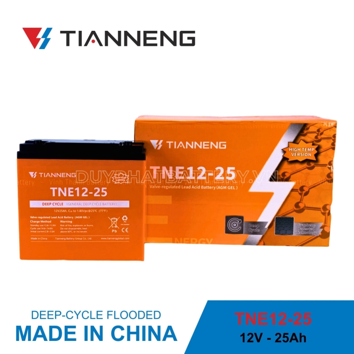 Ắc quy Tianneng TNE12-25 (12V-25Ah) là dòng bình xe đạp điện Thiên Năng chuyên dụng, được phân phối chính hãng tại Duy Phát Battery. Sản phẩm sử dụng công nghệ VRLA kín khí – miễn bảo dưỡng, cho dòng phóng ổn định, tuổi thọ cao và đặc biệt phù hợp với điều kiện khí hậu Việt Nam.