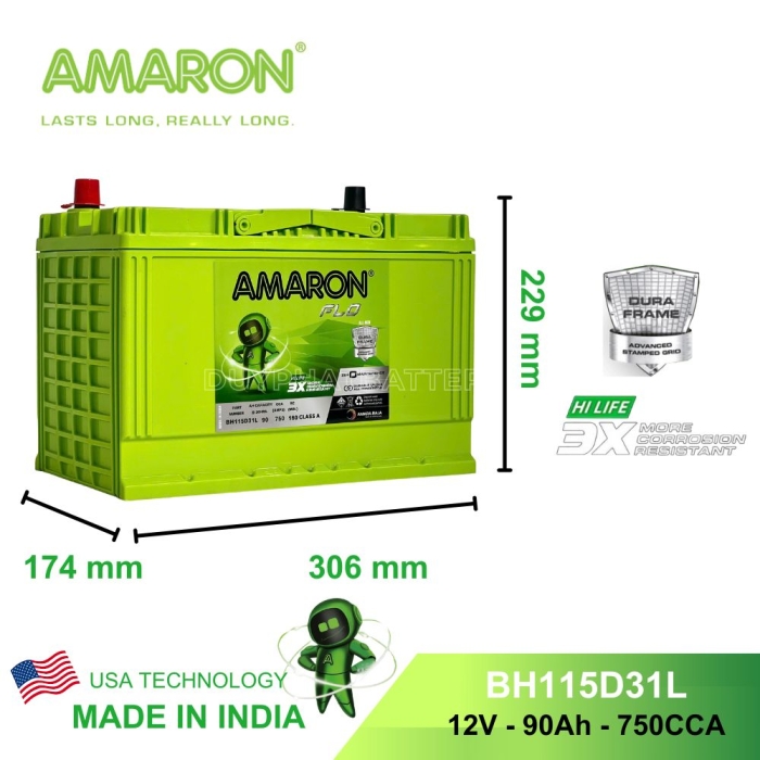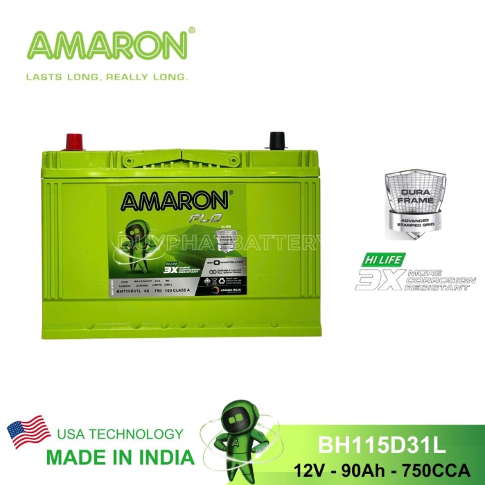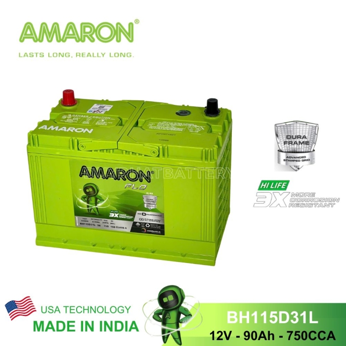 Bình ắc quy Amaron BH115D31L có kích thước quy chuẩn D31 (Chiều dài bình ắc quy tối đa 31cm), sử dụng cho các dòng xe công suất lớn với màu xanh lá cây đặc trưng cùng nhiều đặc tính ưu việt: