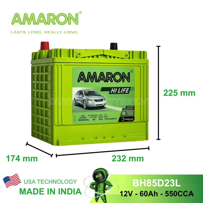 Bình ắc quy Amaron BH85D23LS có kích thước quy chuẩn D23 (Chiều dài bình ắc quy tối đa 23cm), sử dụng cho các dòng xe công suất trung bình với màu xanh lá cây đặc trưng cùng nhiều đặc tính ưu việt: