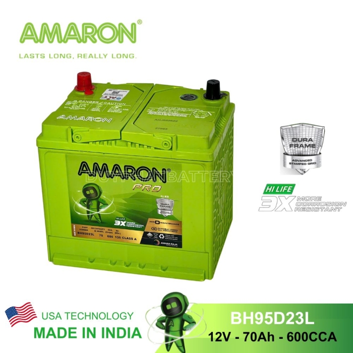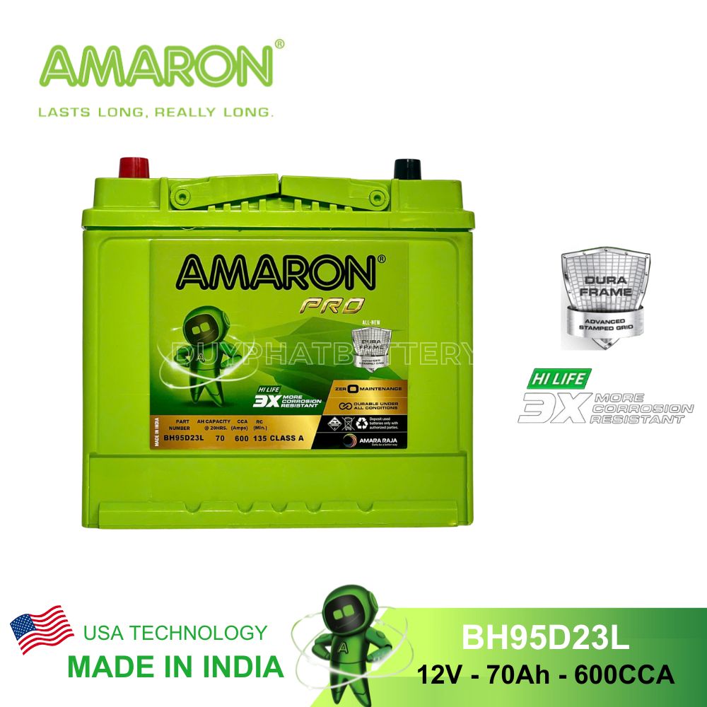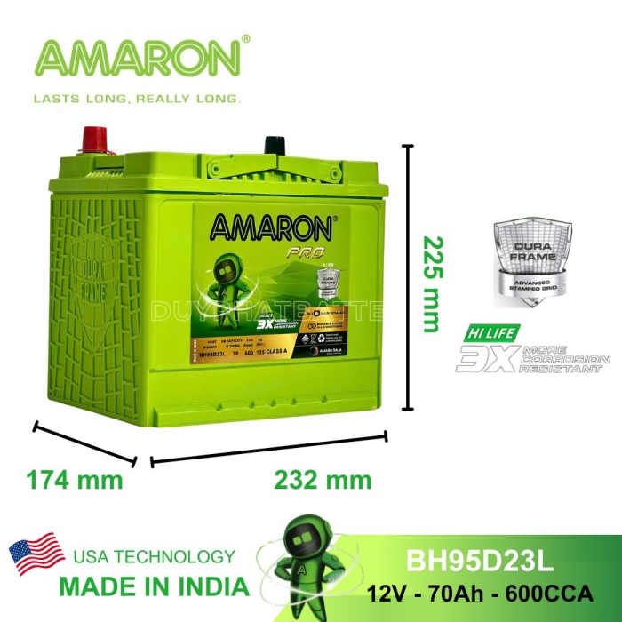 Bình ắc quy Amaron BH95D23L có kích thước quy chuẩn D23 (Chiều dài bình ắc quy tối đa 23cm), sử dụng cho các dòng xe công suất trung bình với màu xanh lá cây đặc trưng cùng nhiều đặc tính ưu việt: