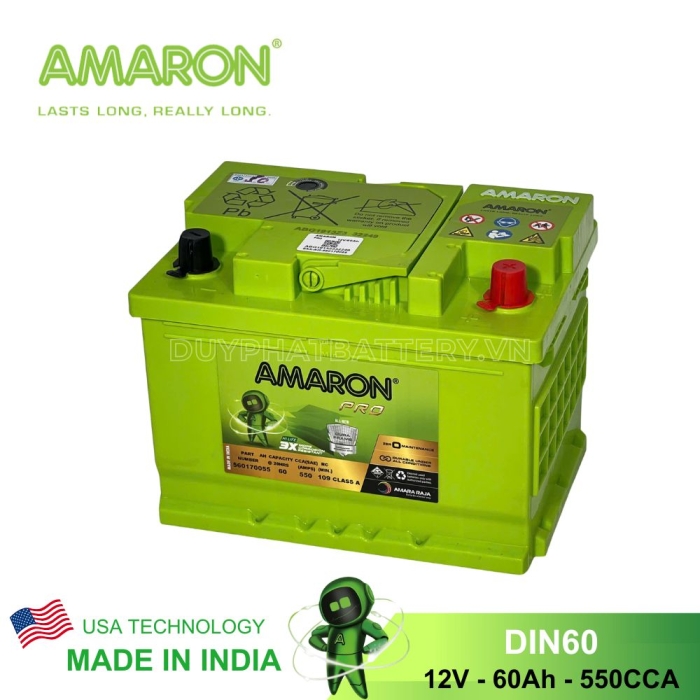 Bình ắc quy AMARON DIN 60 có kích thước quy chuẩn DIN LN2 (chiều dài bình ắc quy tối đa 24cm), sử dụng cho các dòng xe công suất lớn với màu xanh lá cây đặc trưng cùng nhiều đặc tính ưu việt: