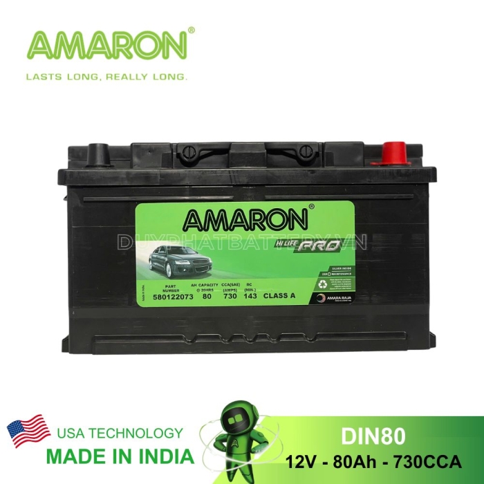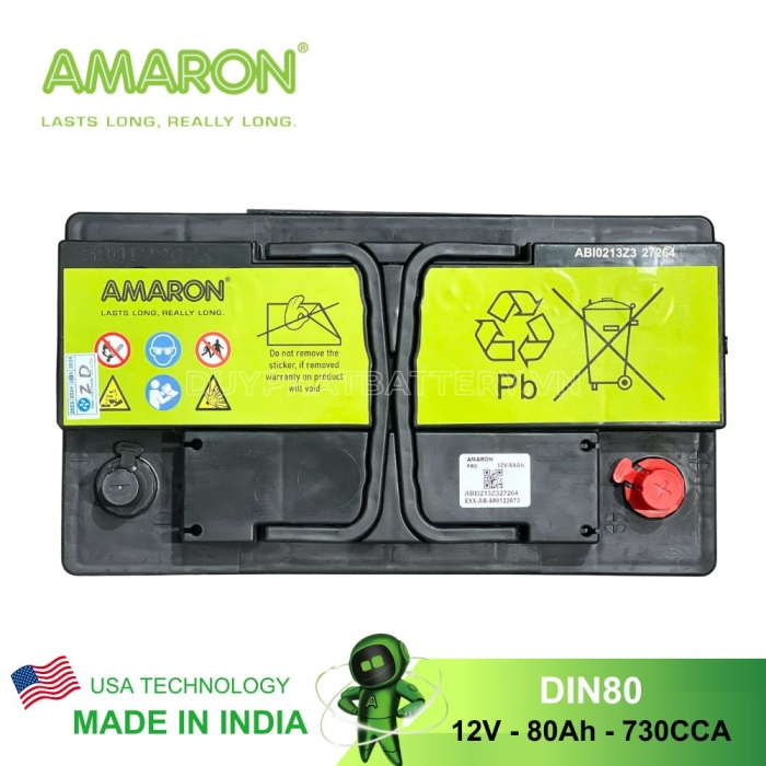 Bình ắc quy Amaron DIN 80 có kích thước quy chuẩn DIN LN4 (chiều dài bình ắc quy tối đa 31.5cm), sử dụng cho các dòng xe công suất lớn với màu xanh lá cây đặc trưng cùng nhiều đặc tính ưu việt:
