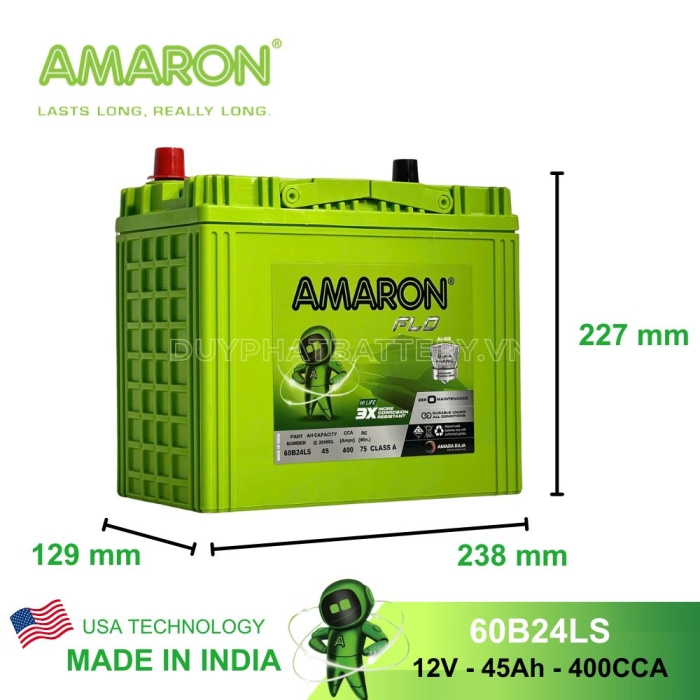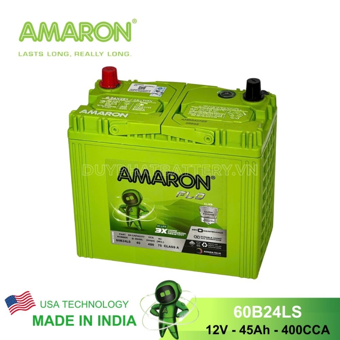 Bình ắc quy Amaron 60B24LS có kích thước quy chuẩn B24 (Chiều dài bình ắc quy tối đa 24cm), cọc nghịch, kiểu cọc lớn, không có chân đế, sử dụng cho các dòng xe công suất phổ thông với màu xanh lá cây đặc trưng cùng nhiều đặc tính ưu việt: