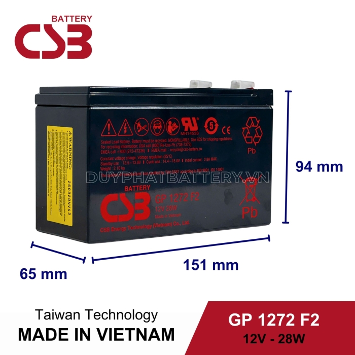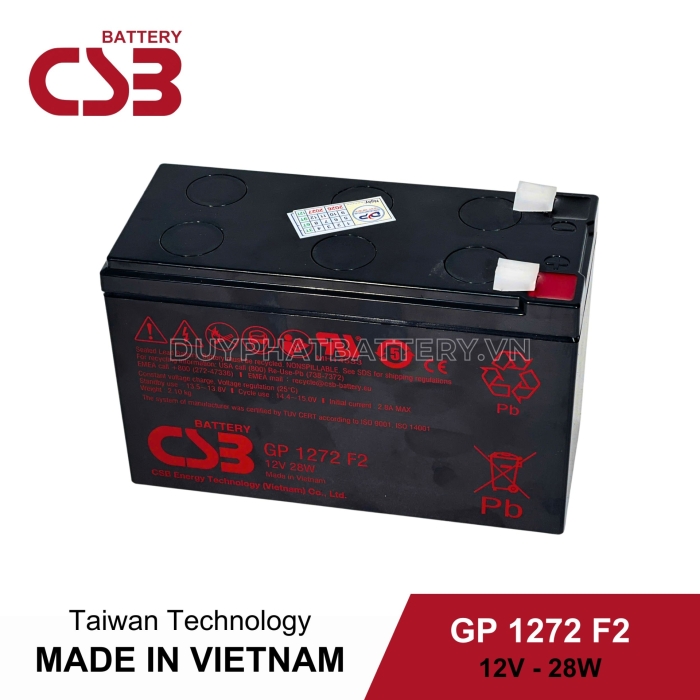Ắc quy CSB 12V 7.2Ah GP 1272 F2 được sản xuất theo công nghệ Đài Loan, nhà máy tại Việt Nam