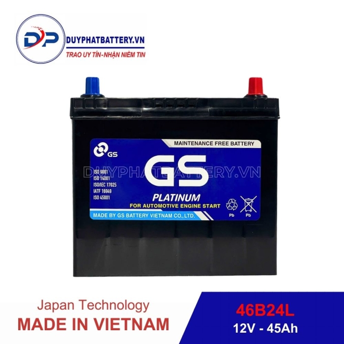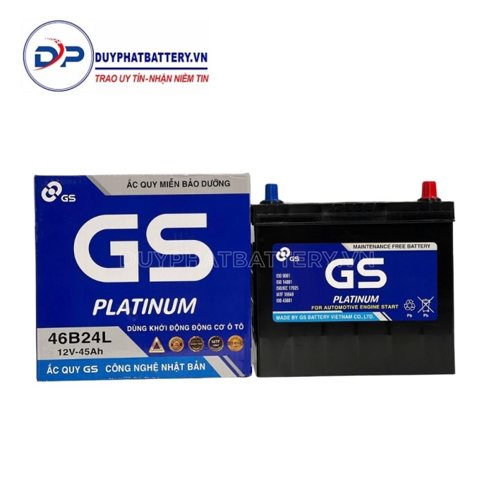 Bình ắc quy GS khô 46B24L (12V-45AH) do Công Ty TNHH Ắc Quy GS Việt Nam Sản Xuất, là một công ty 100% vốn nước ngoài, liên doanh giữa Tập Đoàn GS - YUASA - Nhà sản xuất Ắc Quy axit chì hàng đầu Châu Á, chuyên sản xuất các loại Bình Ắc Quy Ô Tô - Xe Máy và Tập Đoàn MITSUBISHI - Tập Đoàn thương mại lớn nhất Nhật Bản.