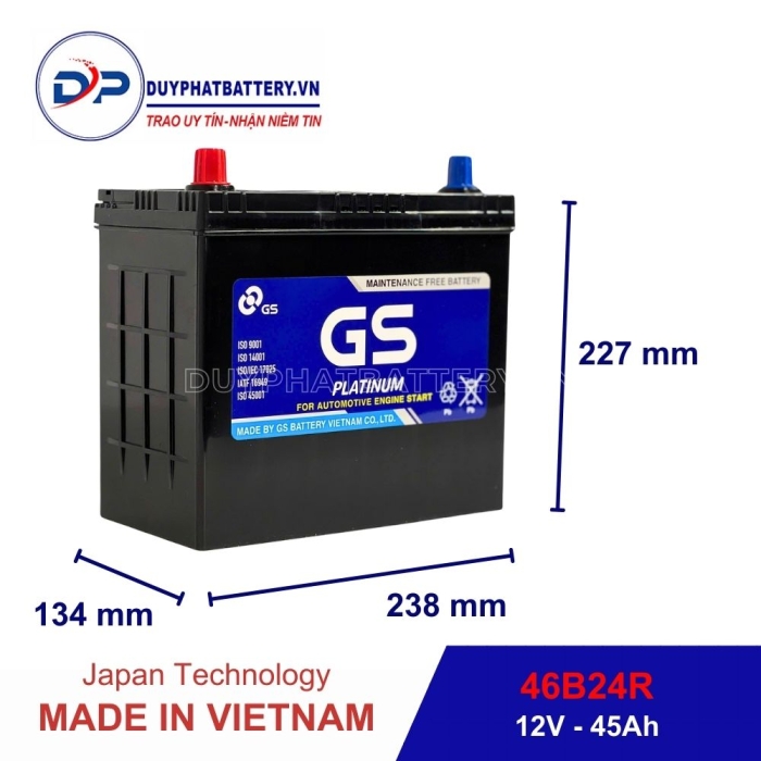 Bình ắc quy GS khô 46B24R (12V-45AH) có công dụng dự trữ và cung cấp nguồn điện cho xe ô tô. Để sử dụng được, hộc chứa ắc quy của xe cần lớn hơn hoặc bằng kích thước thực tế của bình với chiều dài 236mm, rộng 134mm và chiều cao 201mm và tổng chiều cao 227mm.