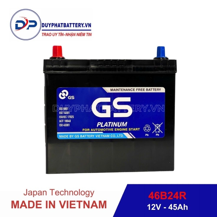 Bình ắc quy GS khô 46B24R (12V-45AH) do Công Ty TNHH Ắc Quy GS Việt Nam Sản Xuất, là một công ty 100% vốn nước ngoài, liên doanh giữa Tập Đoàn GS - YUASA - Nhà sản xuất Ắc Quy axit chì hàng đầu Châu Á, chuyên sản xuất các loại Bình Ắc Quy Ô Tô - Xe Máy và Tập Đoàn MITSUBISHI - Tập Đoàn thương mại lớn nhất Nhật Bản.