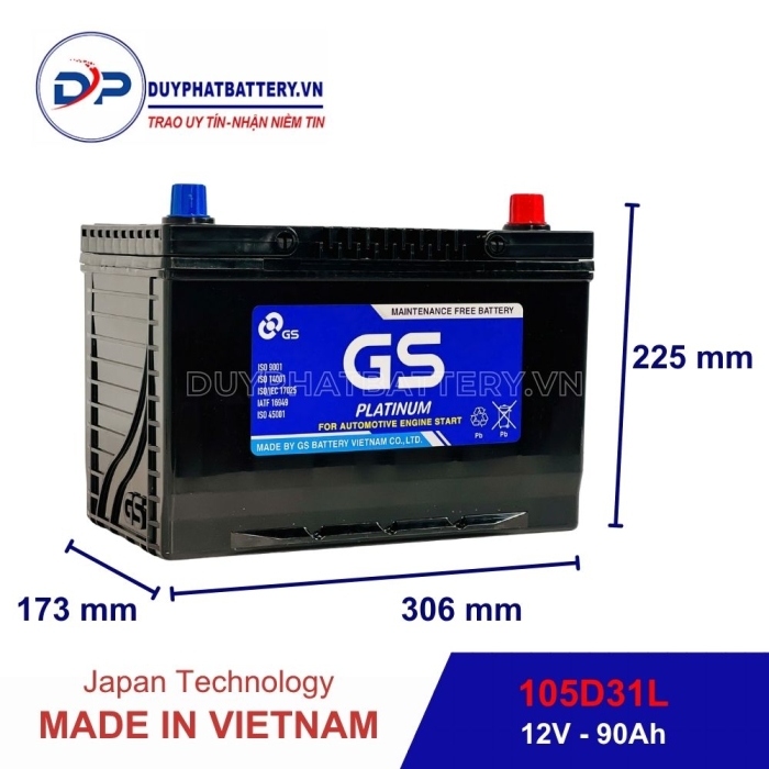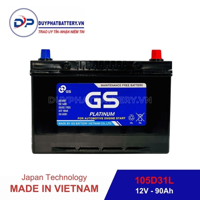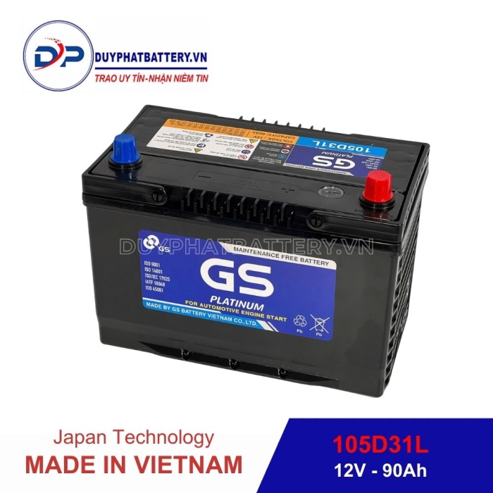 Bình ắc quy GS khô 105D31L (12V-90AH) do Công Ty TNHH Ắc Quy GS Việt Nam Sản Xuất, là một công ty 100% vốn nước ngoài, liên doanh giữa Tập Đoàn GS - YUASA - Nhà sản xuất Ắc Quy axit chì hàng đầu Châu Á, chuyên sản xuất các loại Bình Ắc Quy Ô Tô - Xe Máy và Tập Đoàn MITSUBISHI - Tập Đoàn thương mại lớn nhất Nhật Bản.