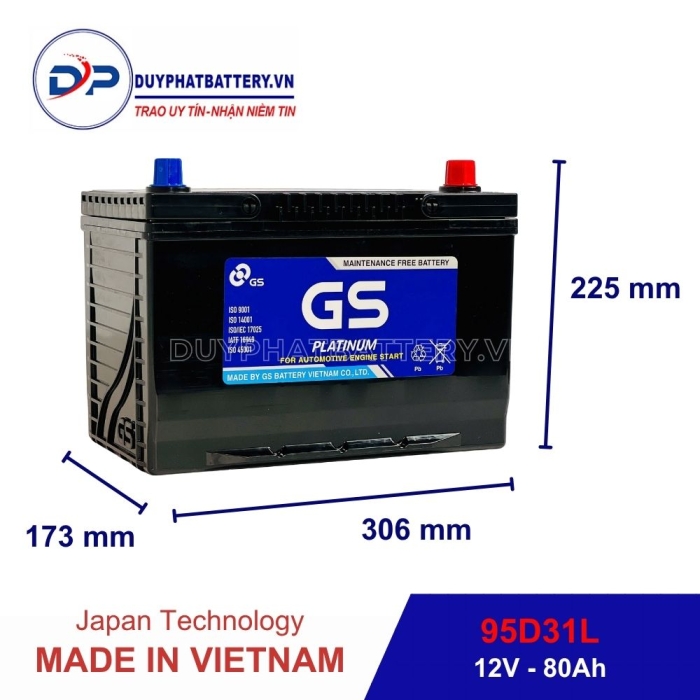 Bình ắc quy GS khô 95D31L (12V-80AH) do Công Ty TNHH Ắc Quy GS Việt Nam Sản Xuất, là một công ty 100% vốn nước ngoài, liên doanh giữa Tập Đoàn GS - YUASA - Nhà sản xuất Ắc Quy axit chì hàng đầu Châu Á, chuyên sản xuất các loại Bình Ắc Quy Ô Tô - Xe Máy và Tập Đoàn MITSUBISHI - Tập Đoàn thương mại lớn nhất Nhật Bản.