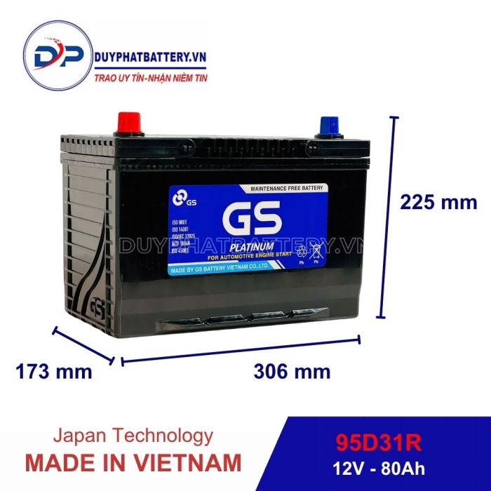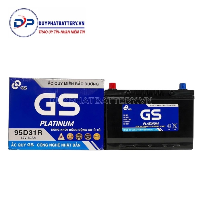 Bình ắc quy GS khô 95D31R (12V-80AH) do Công Ty TNHH Ắc Quy GS Việt Nam Sản Xuất, là một công ty 100% vốn nước ngoài, liên doanh giữa Tập Đoàn GS - YUASA - Nhà sản xuất Ắc Quy axit chì hàng đầu Châu Á, chuyên sản xuất các loại Bình Ắc Quy Ô Tô - Xe Máy và Tập Đoàn MITSUBISHI - Tập Đoàn thương mại lớn nhất Nhật Bản.