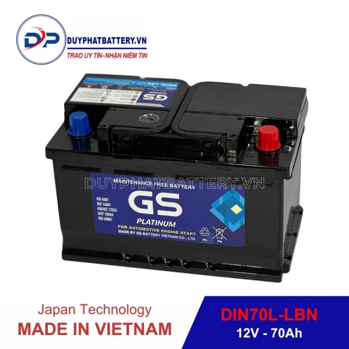 Bình ắc quy GS khô DIN70L-LBN (12V- 70AH) do Công Ty TNHH Ắc Quy GS Việt Nam Sản Xuất, là một công ty 100% vốn nước ngoài, liên doanh giữa Tập Đoàn GS - YUASA - Nhà sản xuất Ắc Quy axit chì hàng đầu Châu Á, chuyên sản xuất các loại Bình Ắc Quy Ô Tô - Xe Máy và Tập Đoàn MITSUBISHI - Tập Đoàn thương mại lớn nhất Nhật Bản.