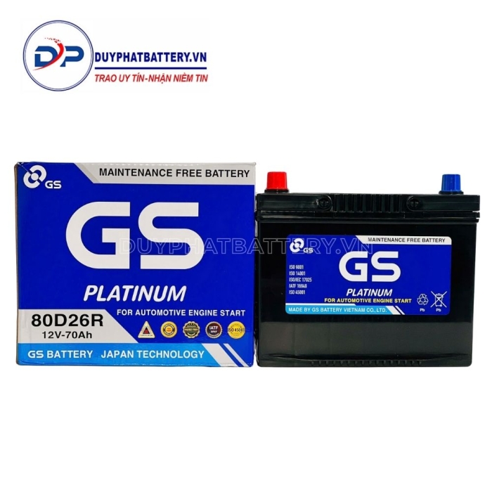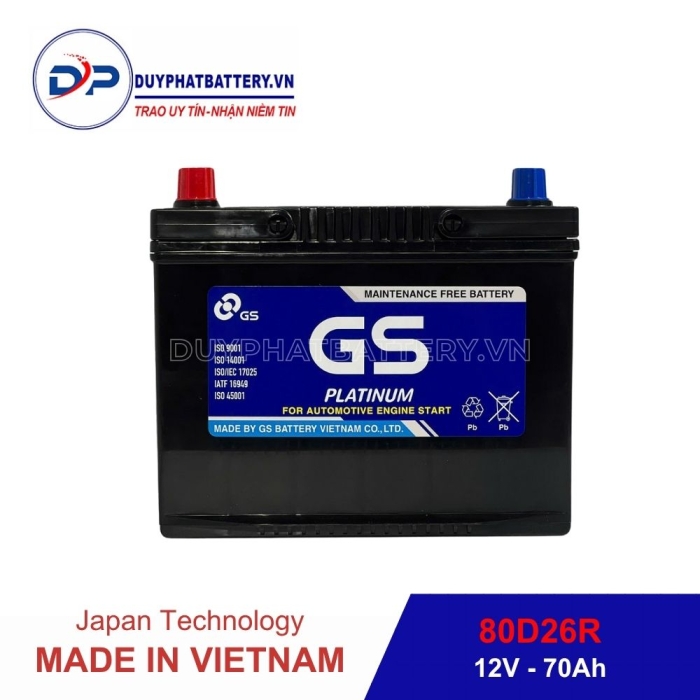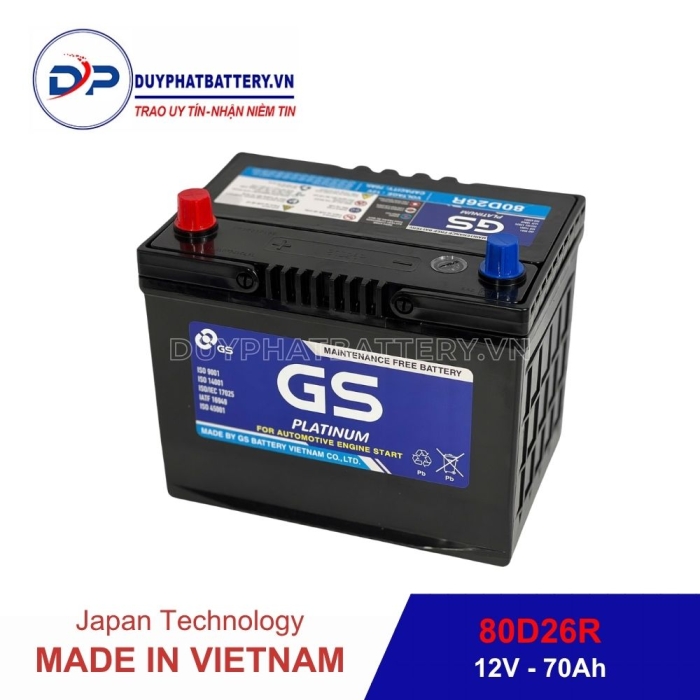 Bình ắc quy GS MF 80D26R (12V-70AH) do Công Ty TNHH Ắc Quy GS Việt Nam Sản Xuất, là một công ty 100% vốn nước ngoài, liên doanh giữa Tập Đoàn GS - YUASA - Nhà sản xuất Ắc Quy axit chì hàng đầu Châu Á, chuyên sản xuất các loại Bình Ắc Quy Ô Tô - Xe Máy và Tập Đoàn MITSUBISHI - Tập Đoàn thương mại lớn nhất Nhật Bản.