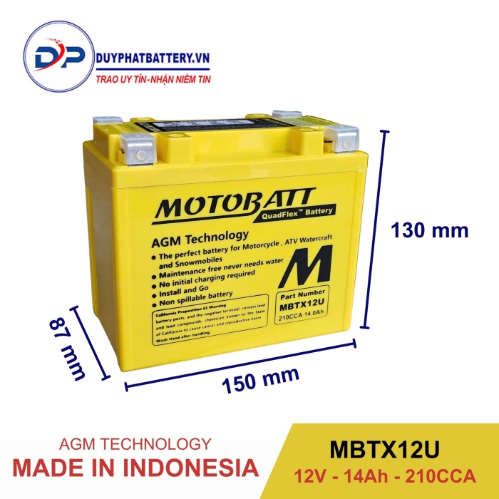 Công ty này đã nhanh chóng trở thành một trong những nhà sản xuất bình ắc quy tốt nhất trên thị trường với các sản phẩm chất lượng và dịch vụ khách hàng tốt. Bình ắc quy Motobatt MBTX12U sử dụng công nghệ hiện đại và quy trình sản xuất tiên tiến để đảm bảo chất lượng sản phẩm. Sản phẩm này được thiết kế để cung cấp sức mạnh và độ tin cậy cho các loại xe đa dụng và các phương tiện địa hình.