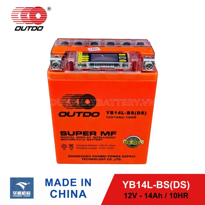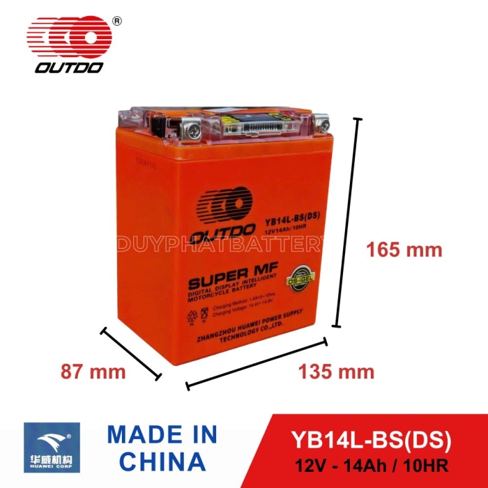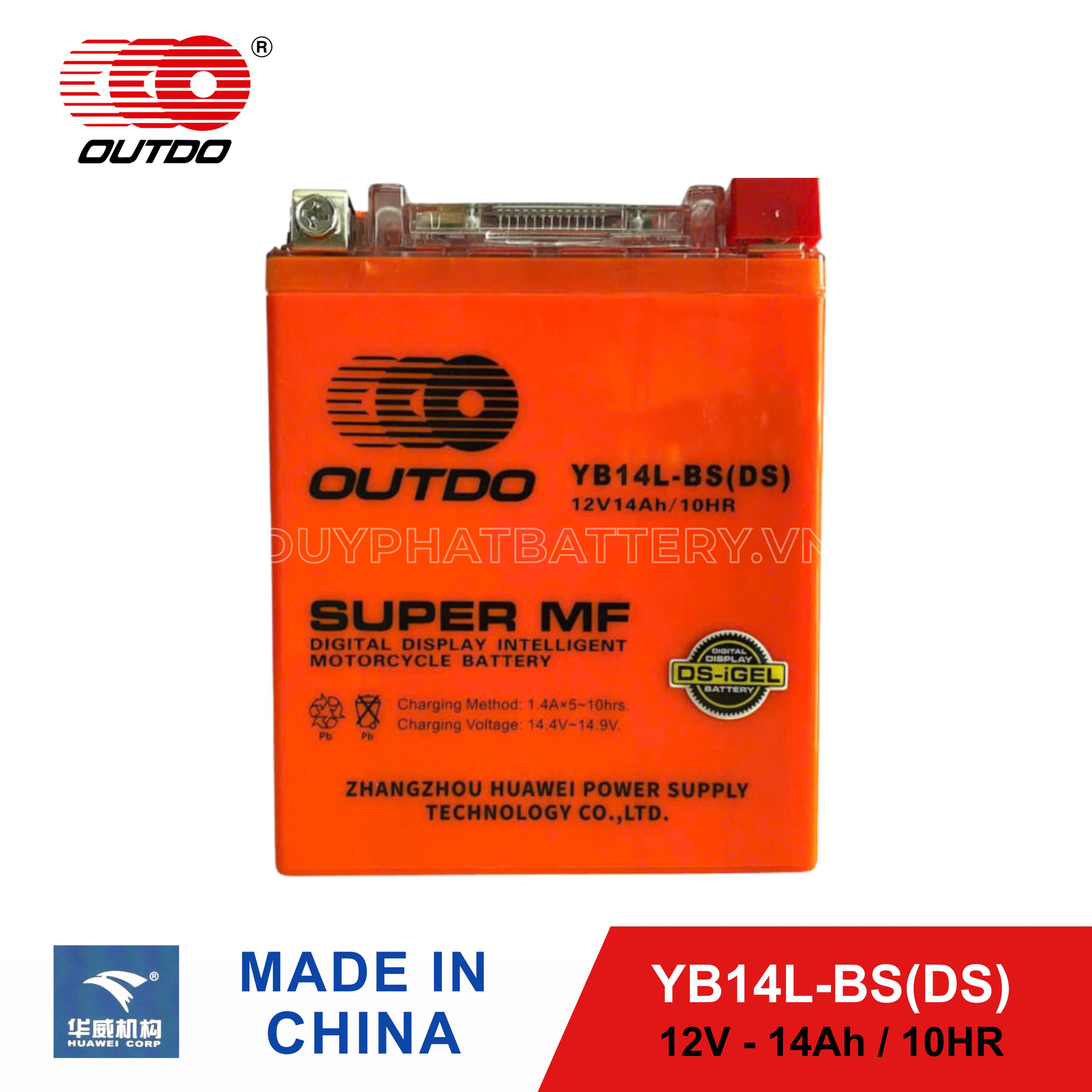 Các con số trên phản ánh đặc trưng bình ắc quy Outdo YB14L-BSDS (12V-14Ah) phù hợp với nhiều dòng xe nặng yêu cầu điện lớn.