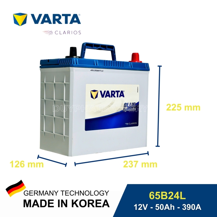 Bình ắc quy Varta 65B24L có kích thước quy chuẩn B24 (chiều rộng và chiều cao khổ B, chiều dài bình ắc quy tối đa 24cm), cọc nghịch, kiểu cọc tiêu chuẩn, thuộc phân khúc Varta Blue Dynamic là sự lựa chọn tối ưu dành cho các dòng xe hiện đại không có công nghệ dừng khởi động Start-Stop với năng lượng mạnh mẽ cùng hiệu suất cao hơn: