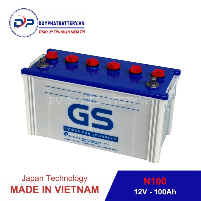 Bình GS nước N100 (12V-100AH) do Công Ty TNHH Ắc Quy GS Việt Nam Sản Xuất, là một công ty 100% vốn nước ngoài, liên doanh giữa Tập Đoàn GS - YUASA - Nhà sản xuất Ắc Quy axit chì hàng đầu Châu Á, chuyên sản xuất các loại Bình Ắc Quy Ô Tô - Xe Máy và Tập Đoàn MITSUBISHI - Tập Đoàn thương mại lớn nhất Nhật Bản.