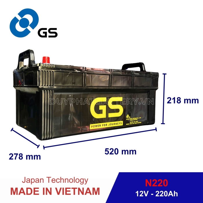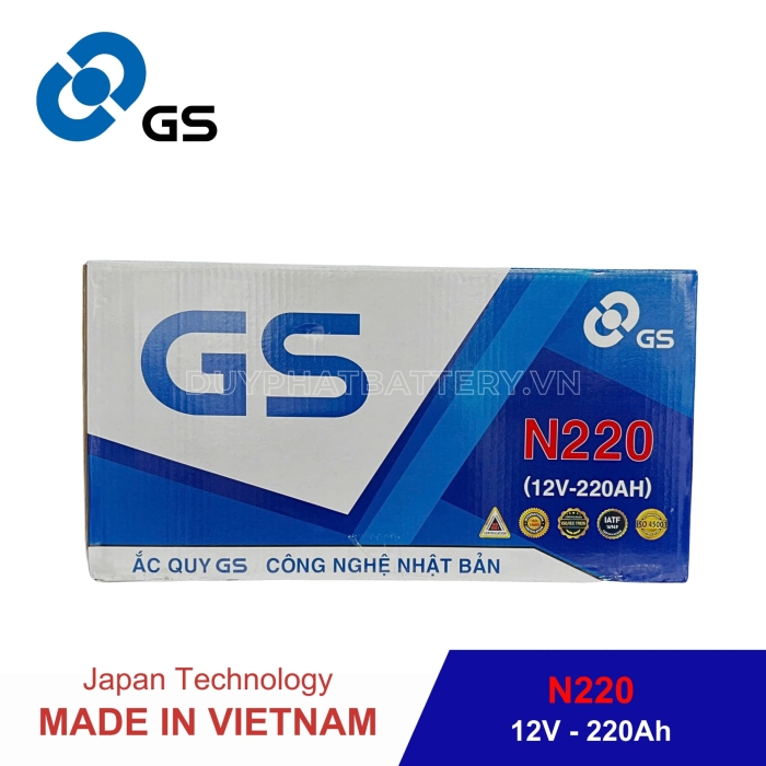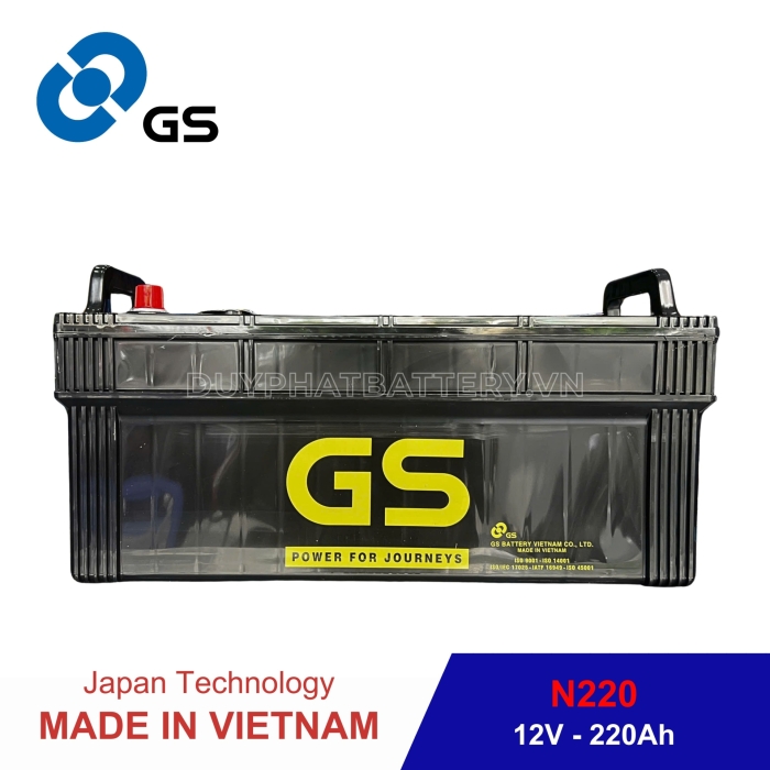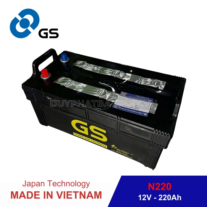 Bình GS nước N220 (12V-220AH) do Công Ty TNHH Ắc Quy GS Việt Nam Sản Xuất, là một công ty 100% vốn nước ngoài, liên doanh giữa Tập Đoàn GS - YUASA - Nhà sản xuất Ắc Quy axit chì hàng đầu Châu Á, chuyên sản xuất các loại Bình Ắc Quy Ô Tô - Xe Máy và Tập Đoàn MITSUBISHI - Tập Đoàn thương mại lớn nhất Nhật Bản.